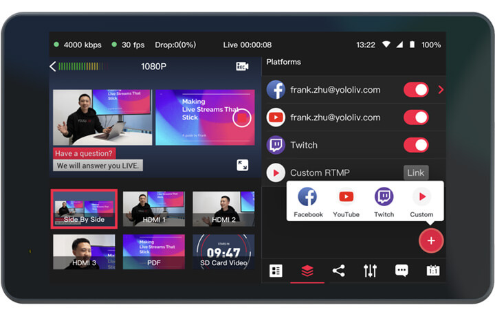 Yolobox can record your live production directly to SD cards or USB storage. With the Ultra you can even record the individual video inputs (ISO) on top of this to have full flexibility to edit in post. Switch seamlessly between inputs, create split screens, picture-in-pictures, and even chromakey for greenscreen productions.