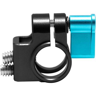 The durable aluminium rod clamp attaches to the cage with the two included 1/4"-20 mounting screws, and a blue locking thumb screw tightens around a separately available 15mm rod